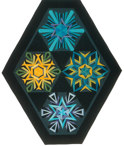 The complete Snowflake pattern with additional color cover sheet and directions to turn your blocks into kaleidoscope like images with hand dyed fabrics. 28″ x 34″.