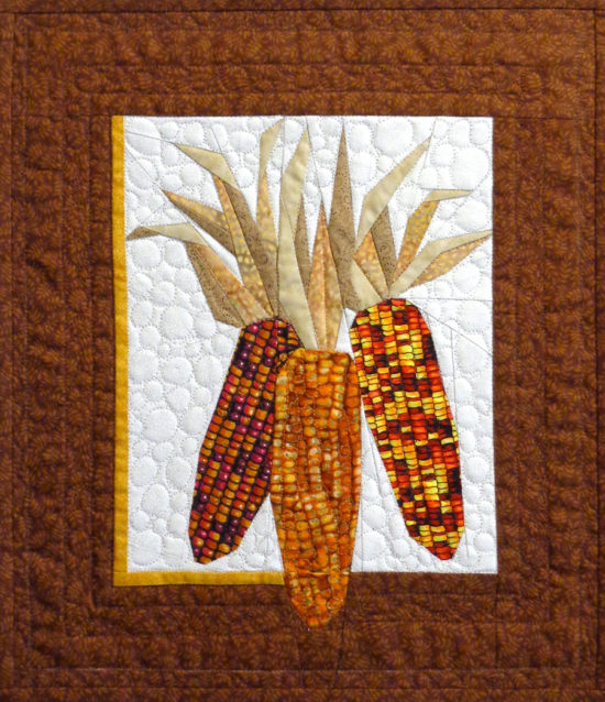 The vibrant colors of autumn are captured in and old favorite: Indian Corn. The fabrics are actually printed corn, which makes the piecing quite simple.